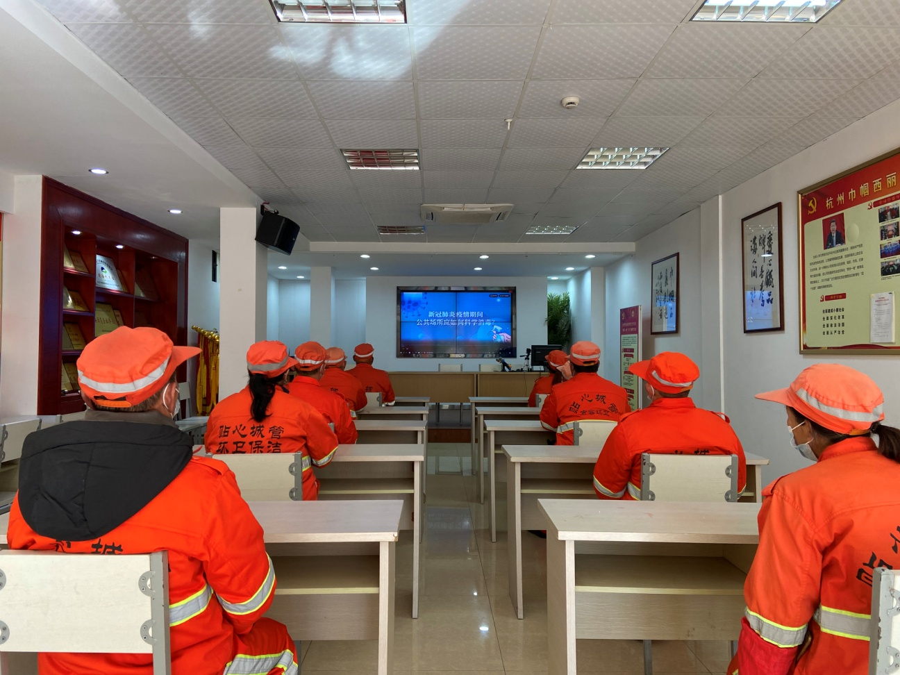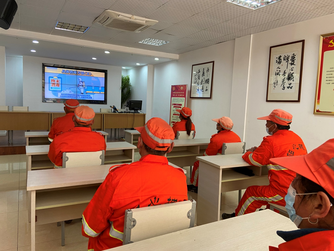 培训根据《杭州市城管系统公共场所消毒工作方案》,结合项目部保洁区域环卫工作的实际情况,从“公共场所应如何科学消毒”和“疫情下的个人防护”两块展开详细讲解。通过观看视频、讲座和问答考试的形式,让员工提高防疫知识,提升防疫工作技能,增加自我防范意识。