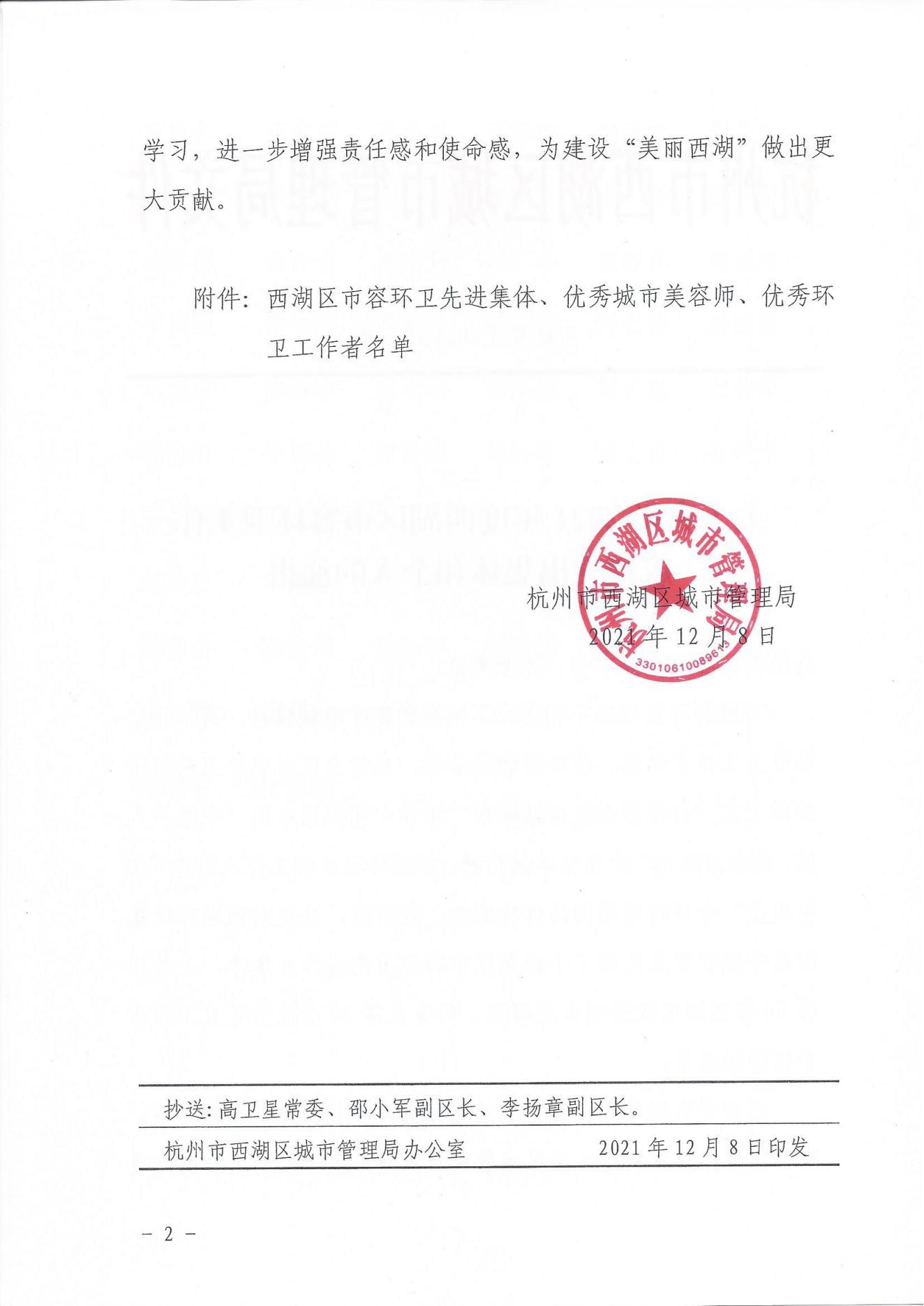 近日,2021年度西湖区市容环卫工作成绩突出集体和个人公布,巾帼西丽集团荣获“西湖区市容环卫先进作业集体”称号。