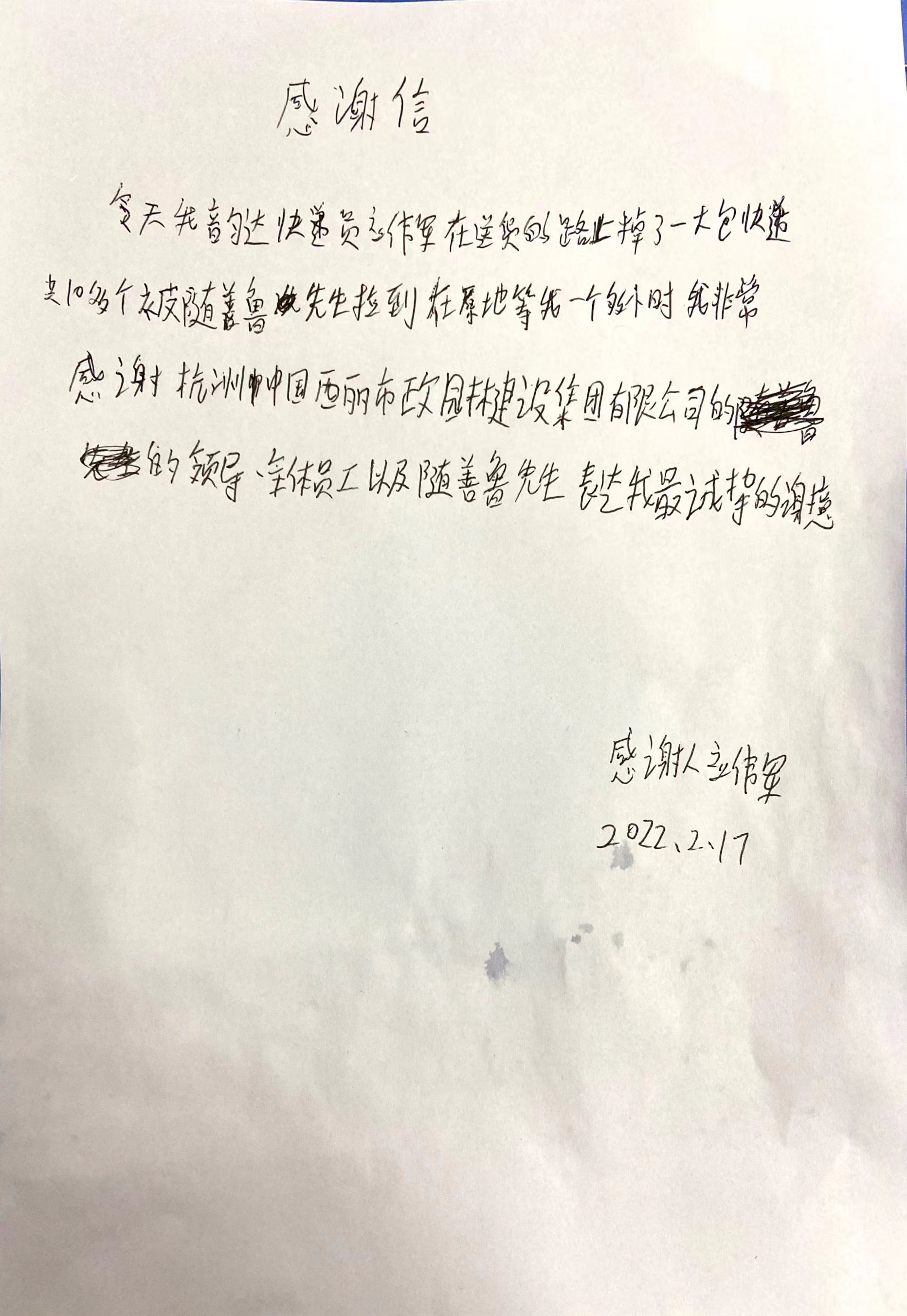 几经周折后终于找到失主,原来是韵达快递小哥应伟军因为着急送货,在路途中不慎丢失的,看到失而复得的包裹,小应万分欣喜。当得知随师傅之前在丢件的地方,冒着风雪等待了他一个多小时后,小应紧握随师傅的手不住地称赞,并激动的写下一份感谢信,表达对随师傅和环卫工人的诚挚谢意。