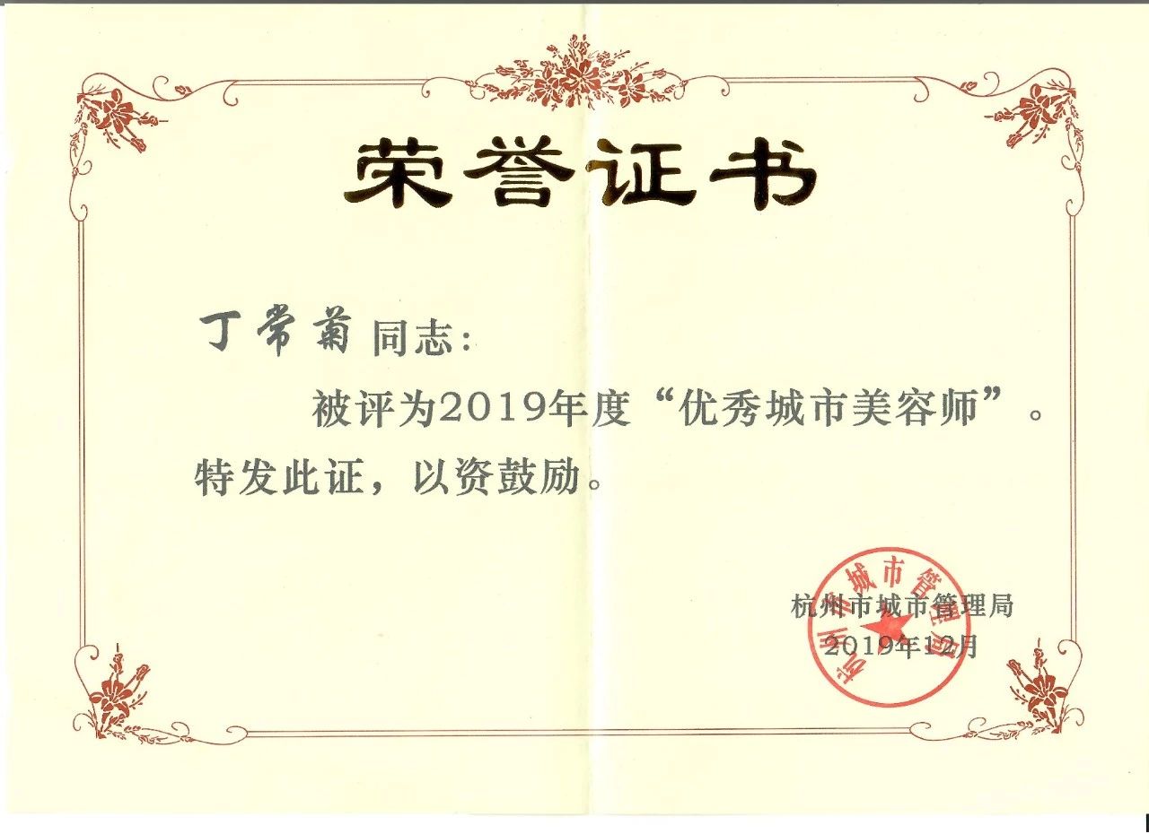 1月8日上午,杭州市城市管理局表彰大会隆重举行,巾帼西丽集团董事长丁常菊喜获2019年度“优秀城市美容师”荣誉称号。